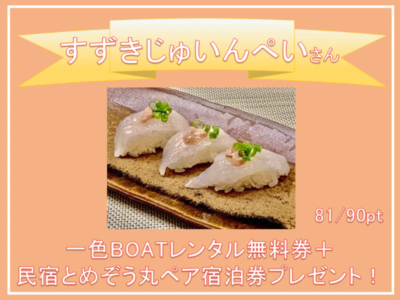 商品は一色BOATの一日券(4,000円相当)と民宿とめぞう丸のペア宿泊券(一名様5,500円相当)です!