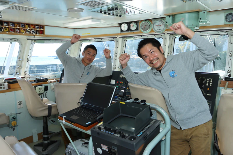巡視艇に乗れてはしゃぐ後藤と高柳