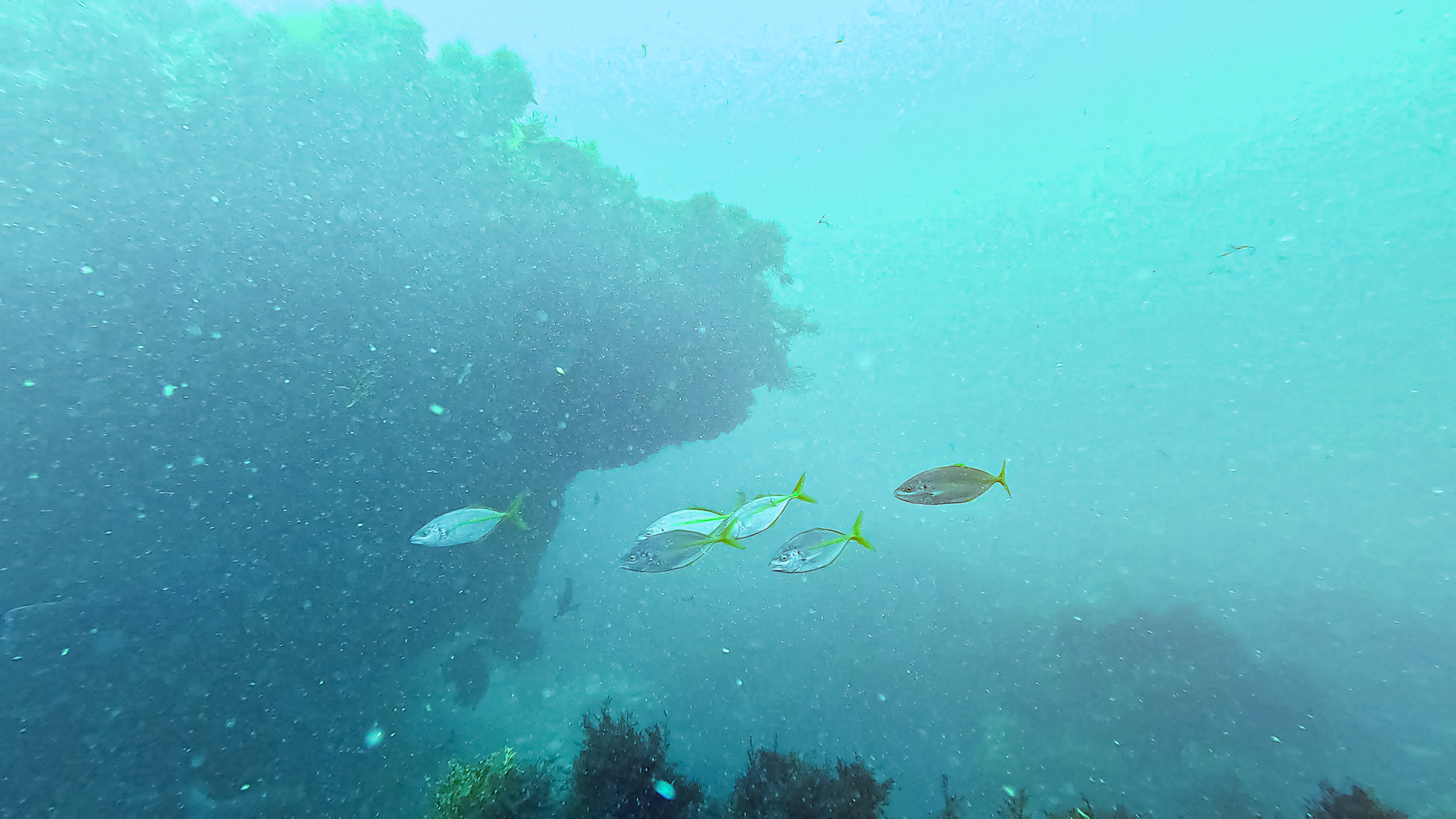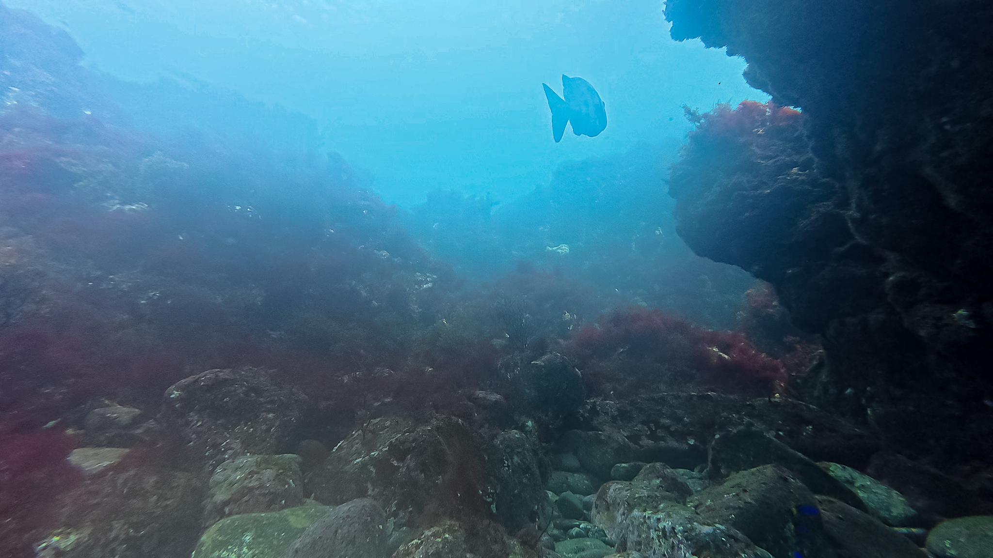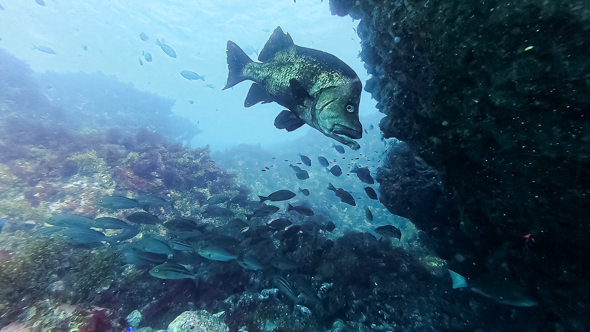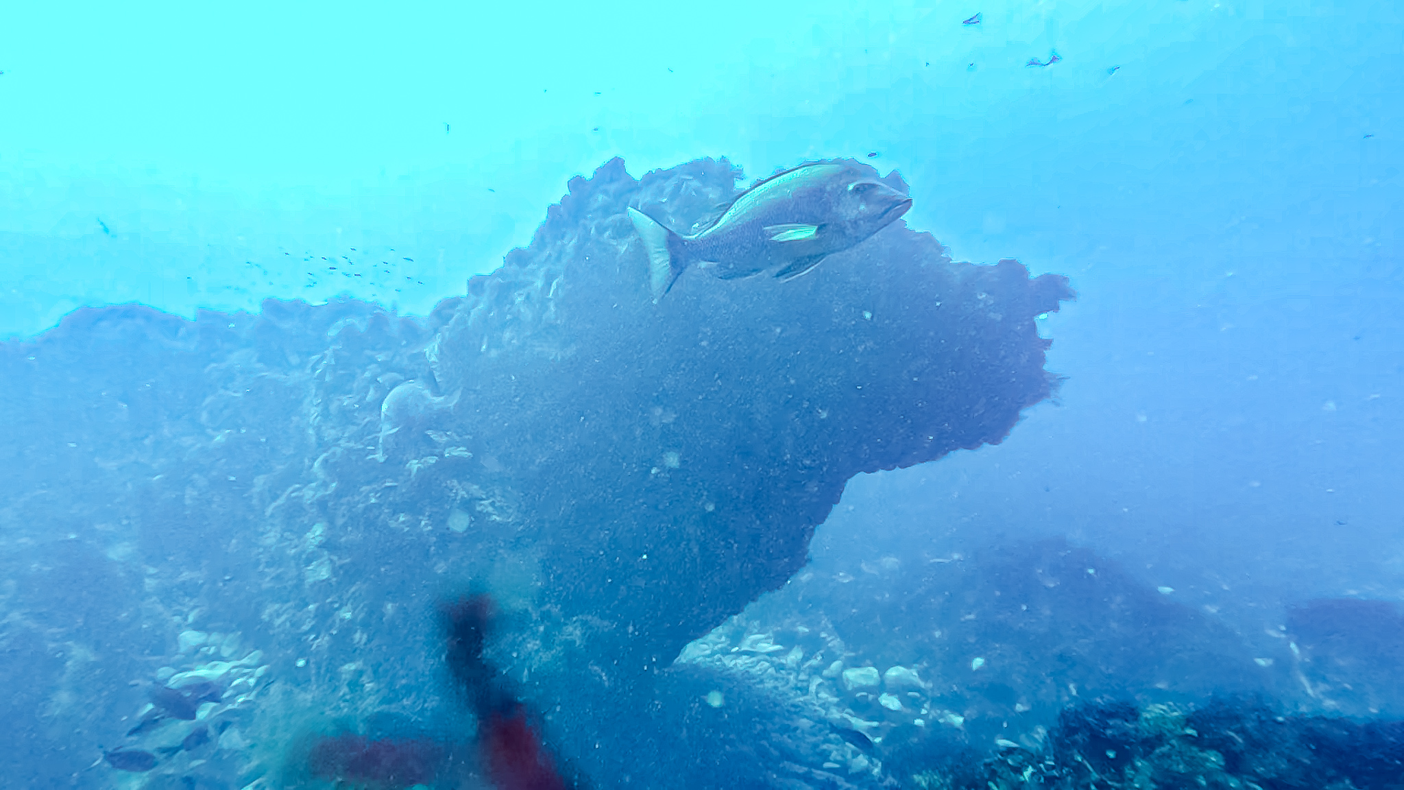 ⇒深場や根周りにはイナダやイサキの群れが居ついていて、カゴ投げ釣りやればすぐ釣れそう。時折コショウダイやマダイ、ハマフエフキやイシダイなんかも顔を出す賑やかな雰囲気で、根がオーバーハングしたところには、これまでに見たこともないヌシが潜んでいた・・・!
