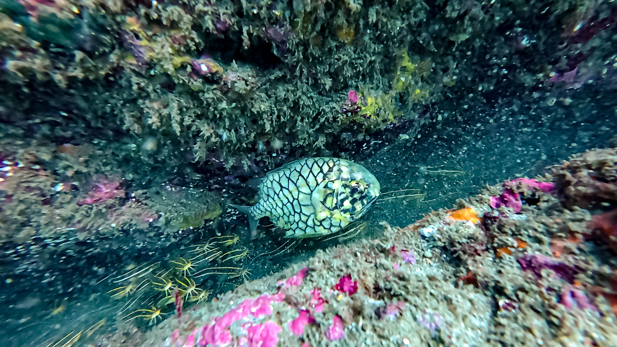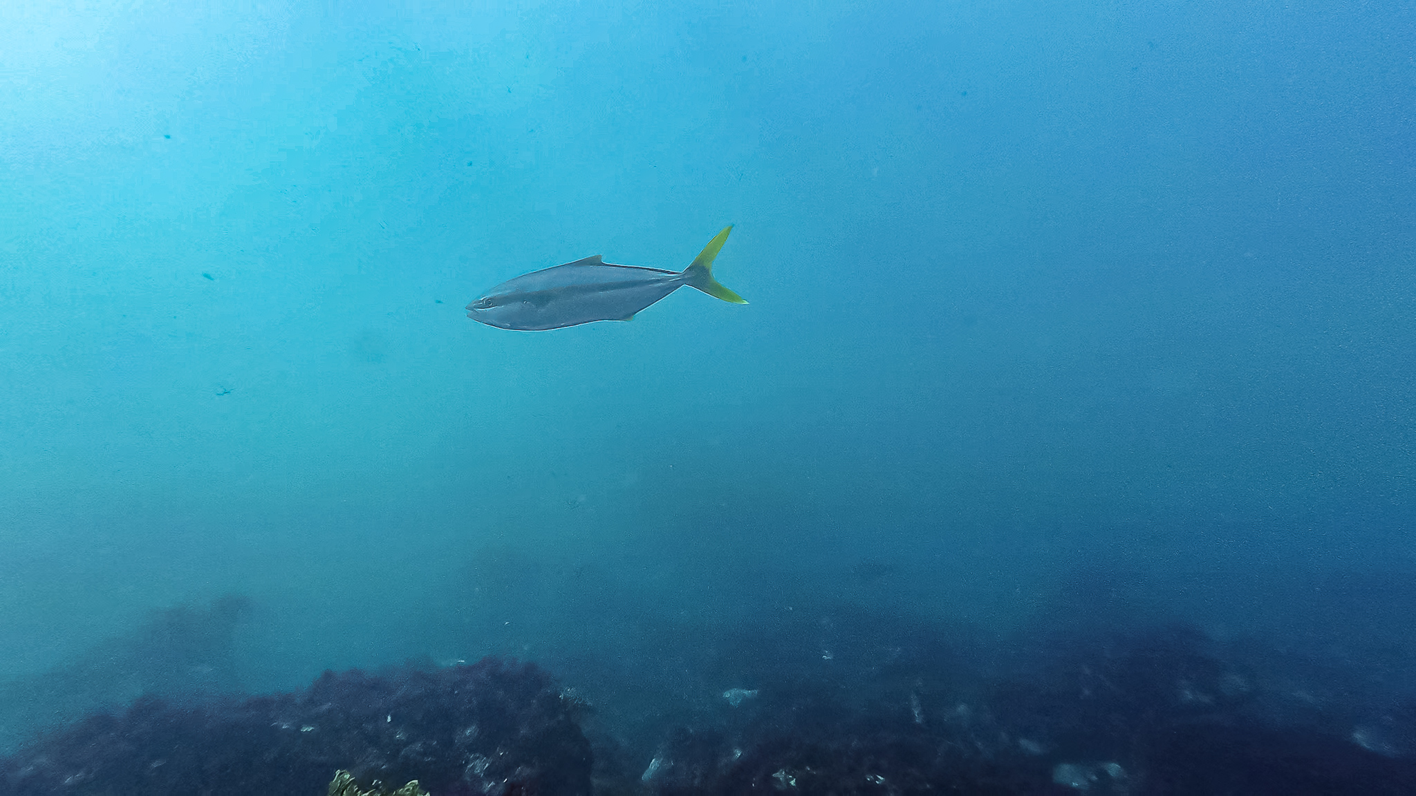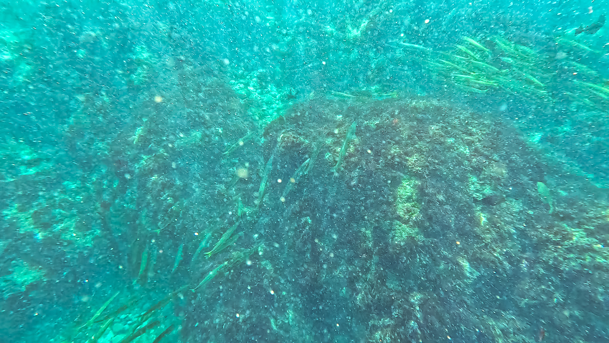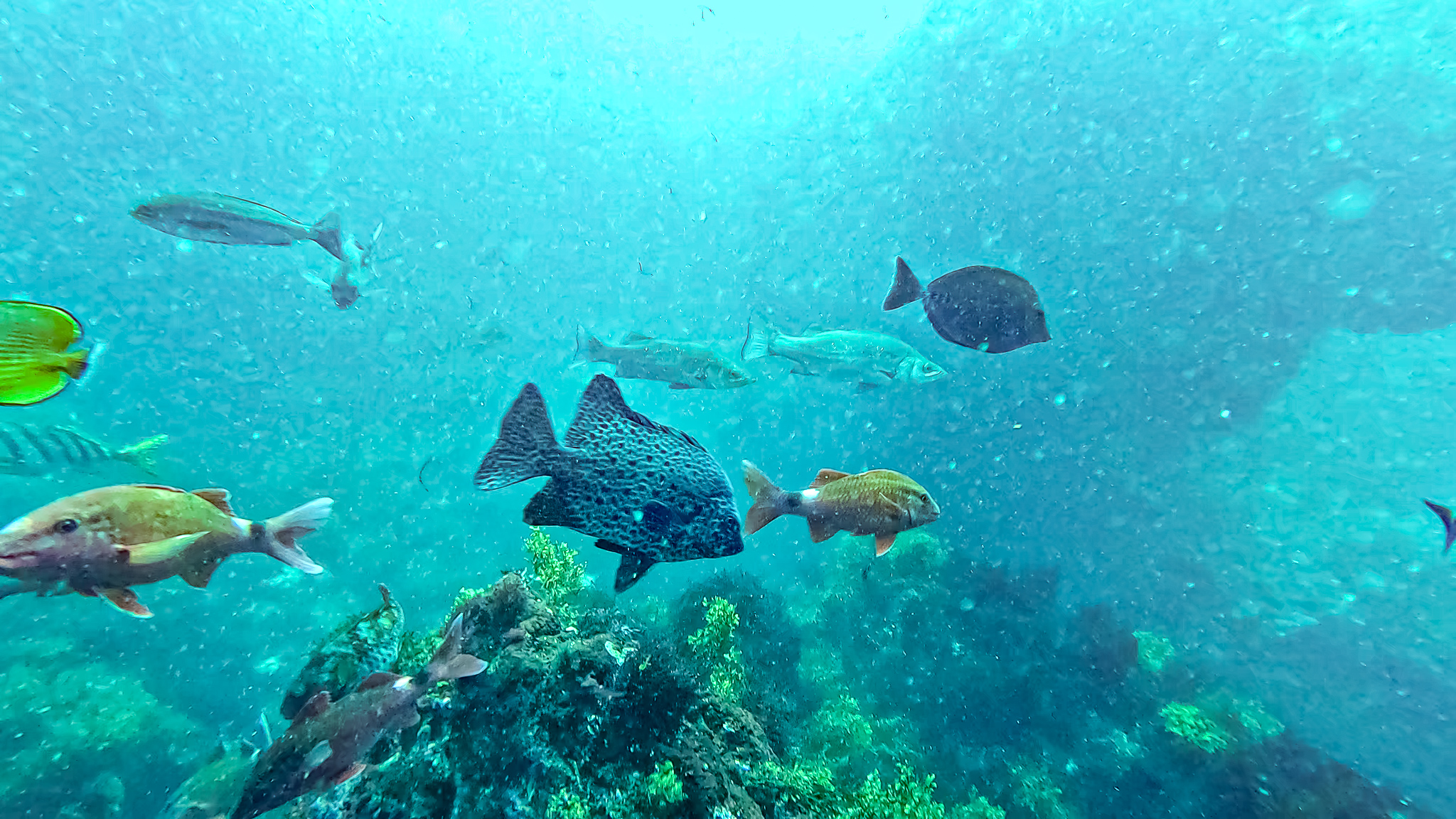 ⇒深場や根周りにはイナダやイサキの群れが居ついていて、カゴ投げ釣りやればすぐ釣れそう。時折コショウダイやマダイ、ハマフエフキやイシダイなんかも顔を出す賑やかな雰囲気で、根がオーバーハングしたところには、これまでに見たこともないヌシが潜んでいた・・・!