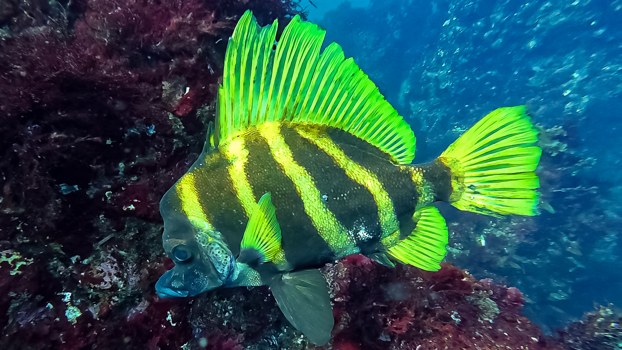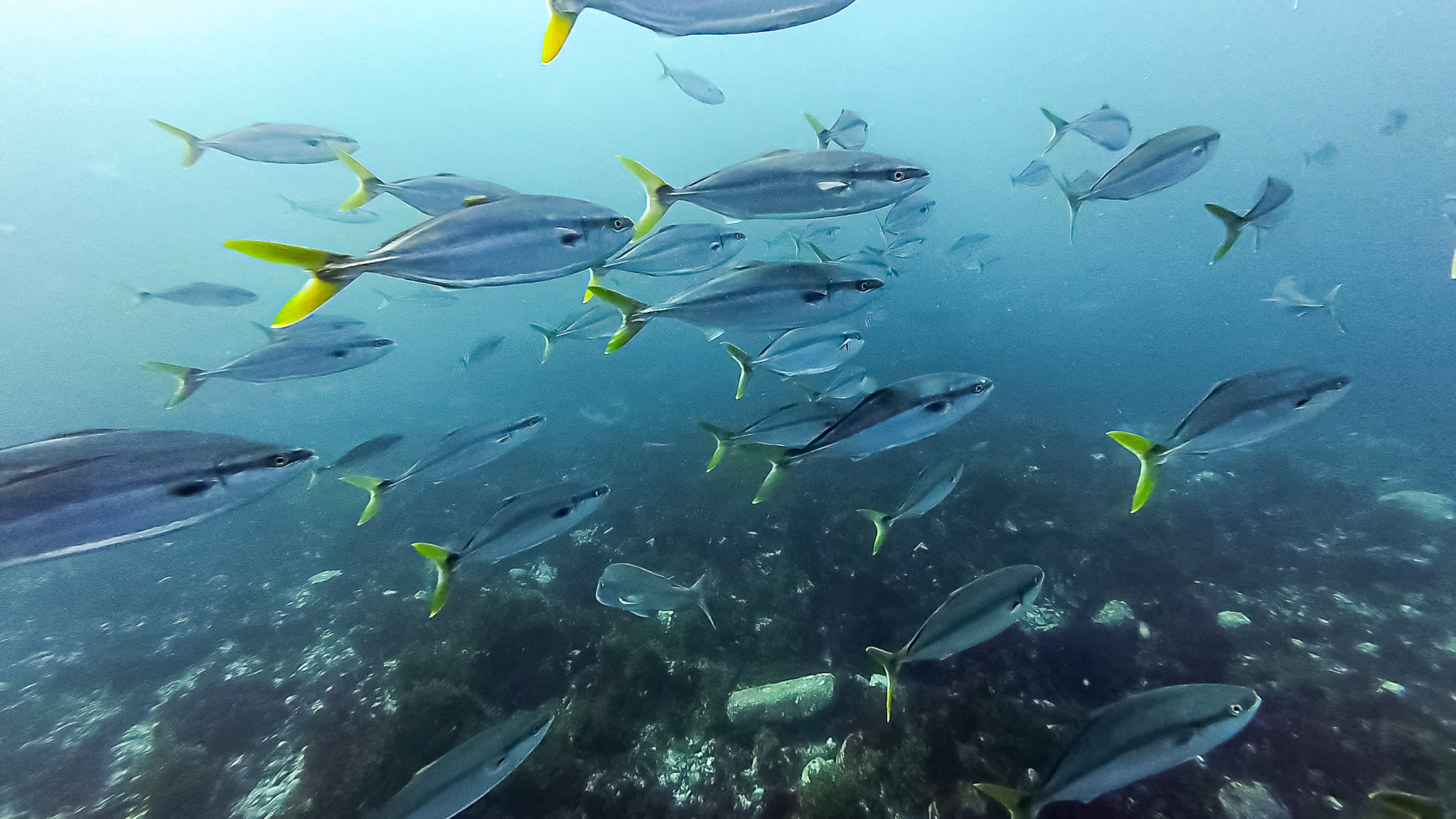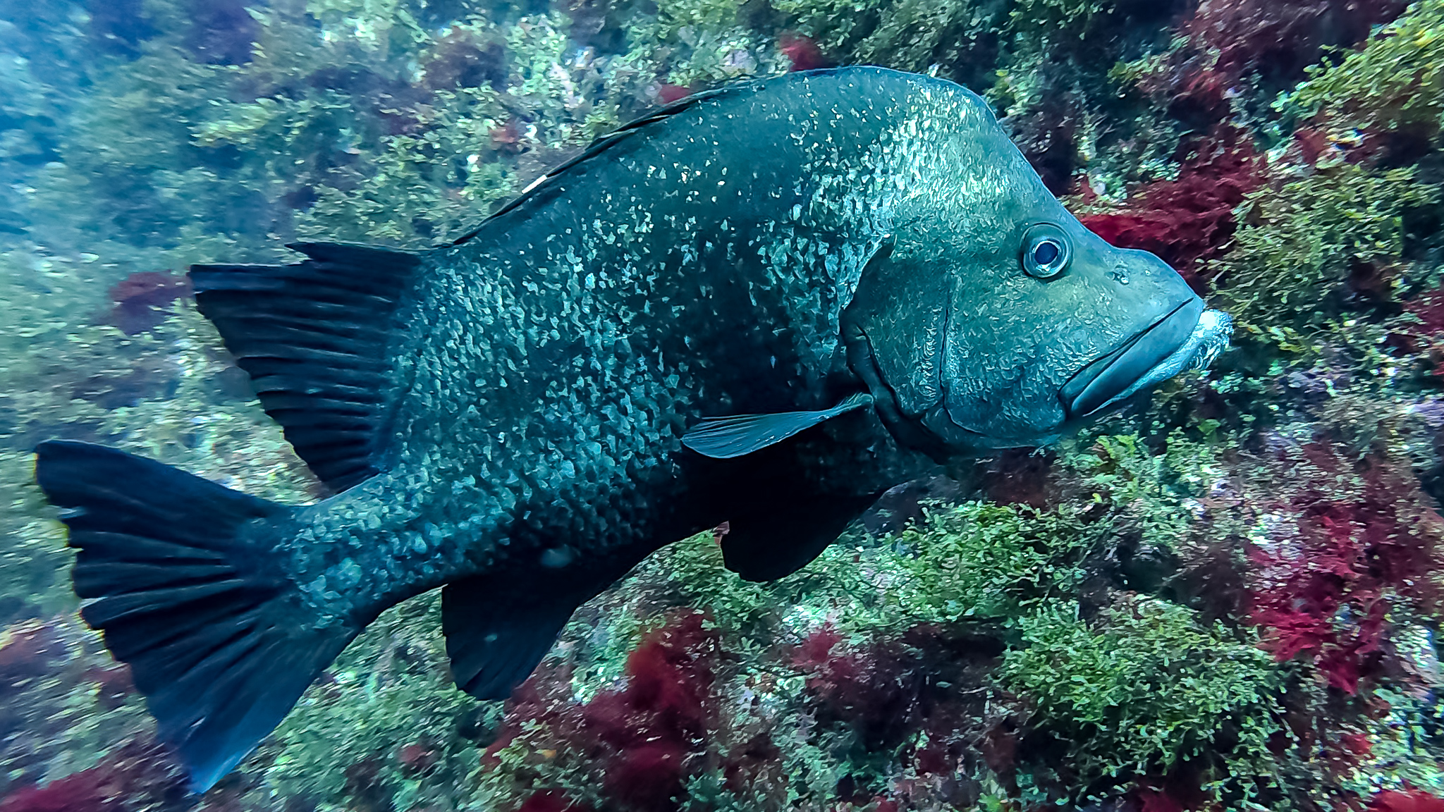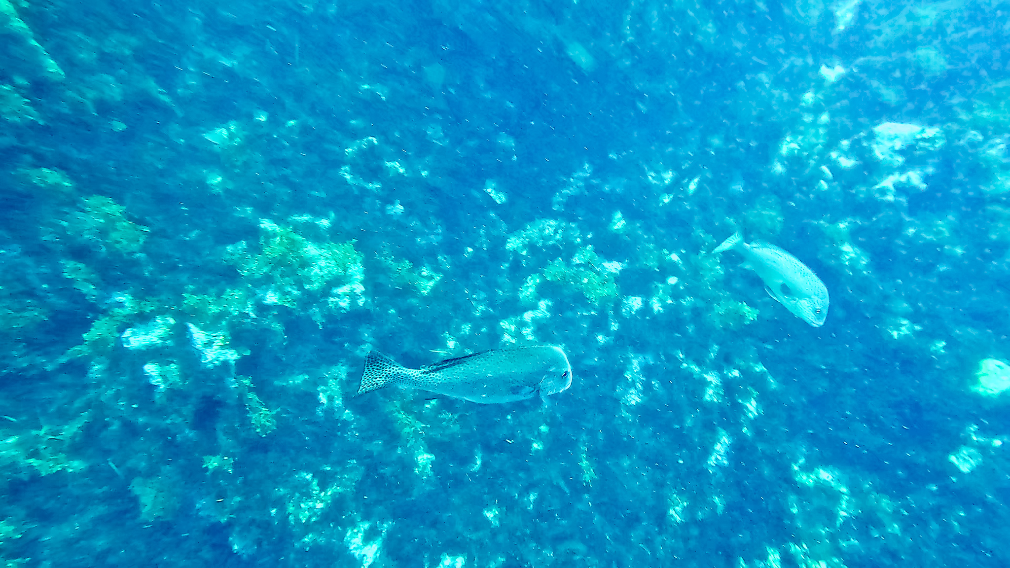⇒深場や根周りにはイナダやイサキの群れが居ついていて、カゴ投げ釣りやればすぐ釣れそう。時折コショウダイやマダイ、ハマフエフキやイシダイなんかも顔を出す賑やかな雰囲気で、根がオーバーハングしたところには、これまでに見たこともないヌシが潜んでいた・・・!
