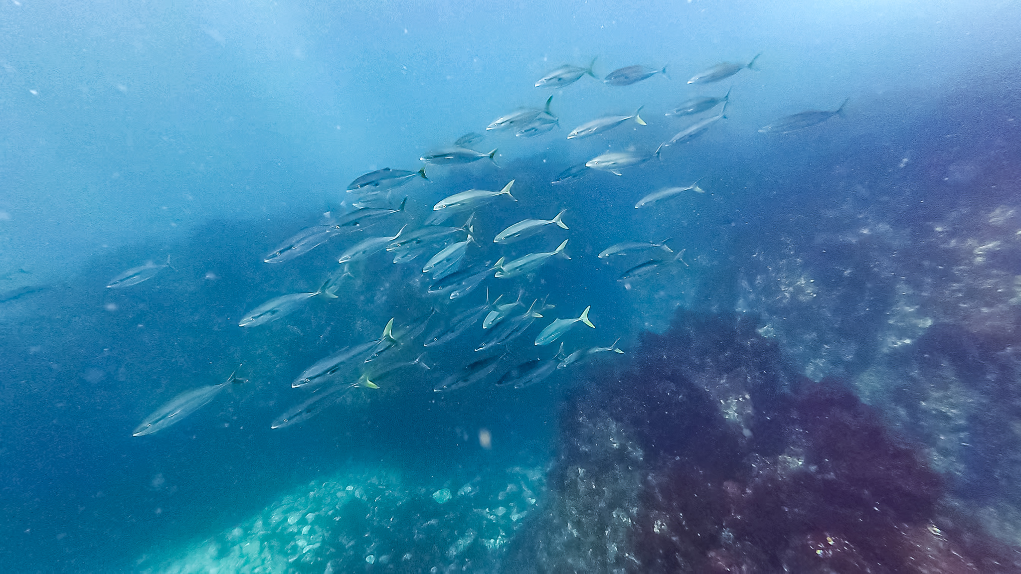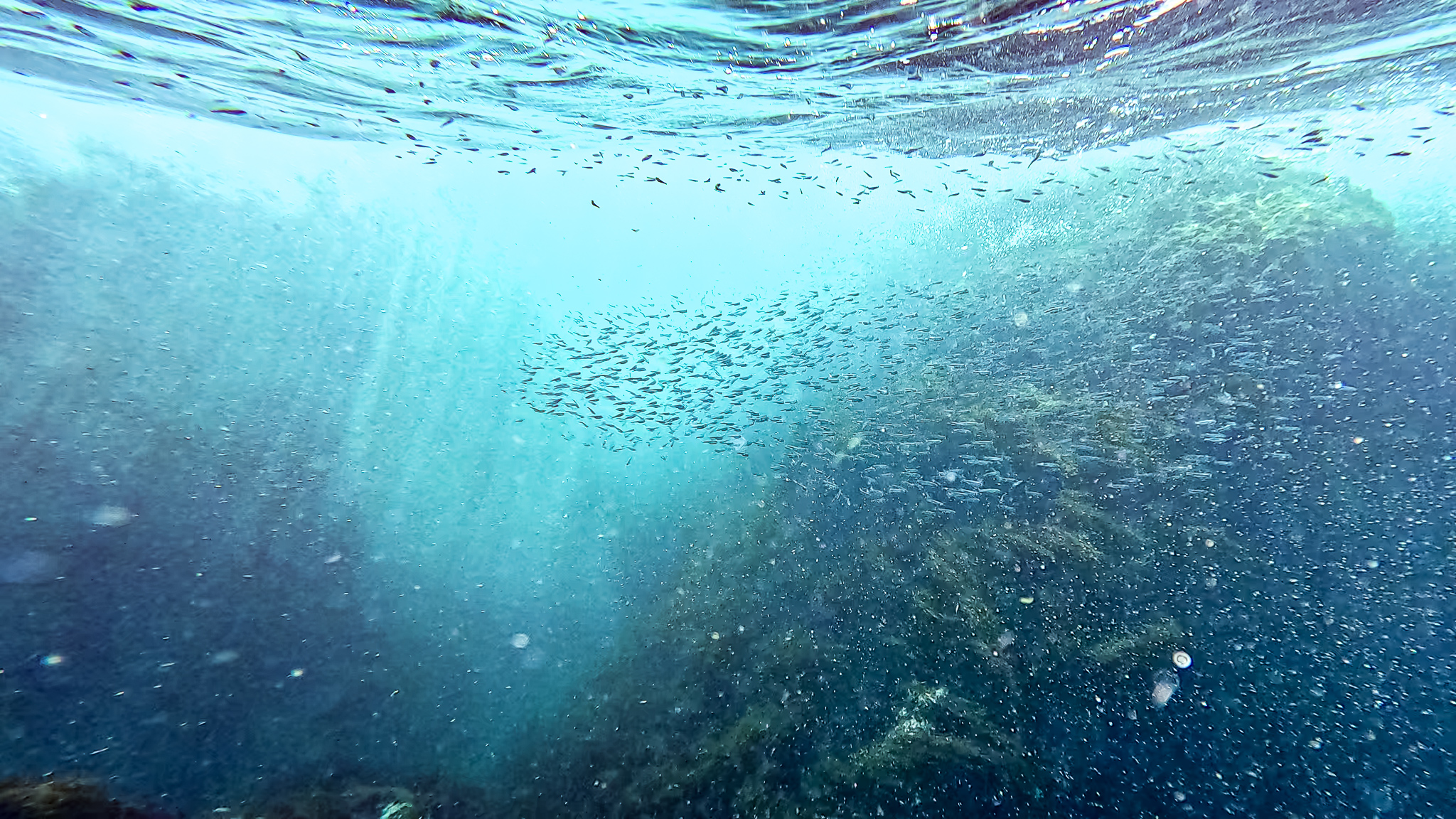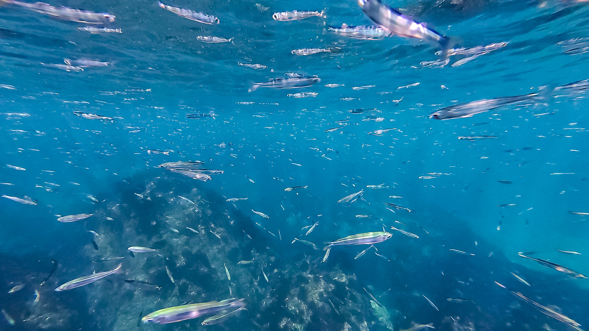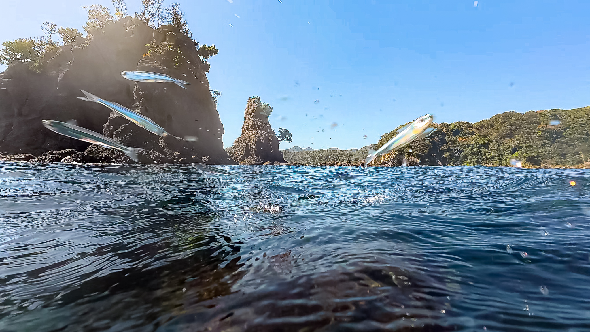 海面に浮かんでいると群れに囲まれ、そのうち頭にコツコツと何かが当たる感触がしたので、顔を出してみるとトウゴロウイワシがジャンプしまくっている。