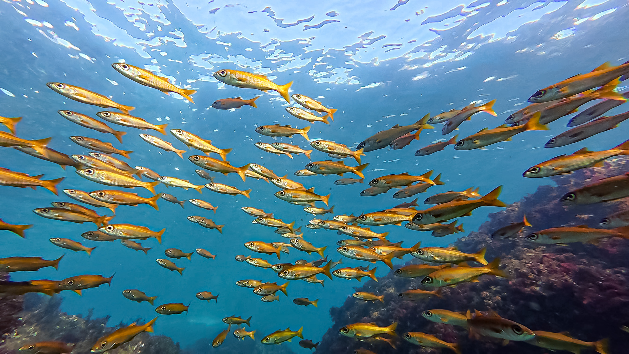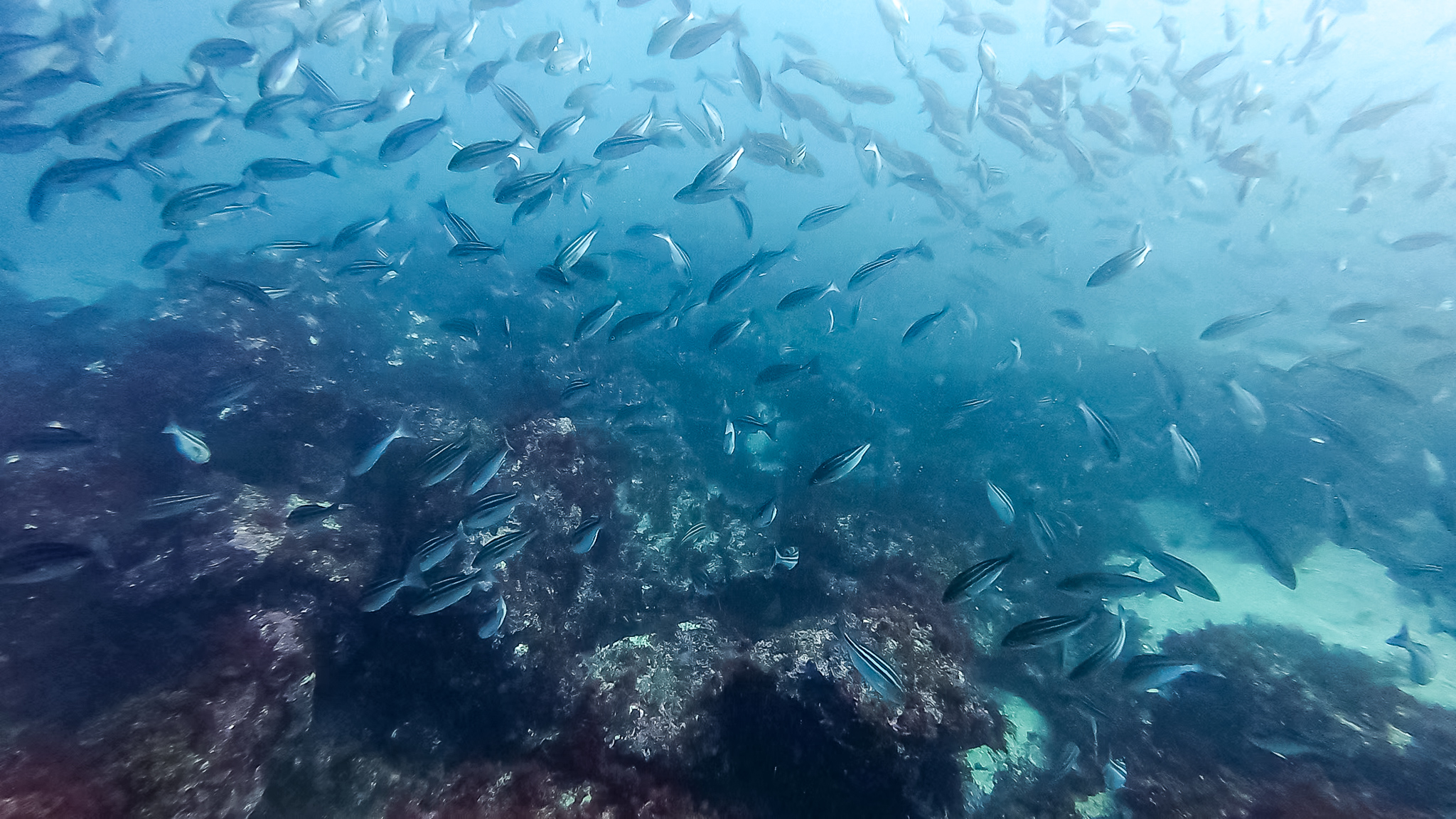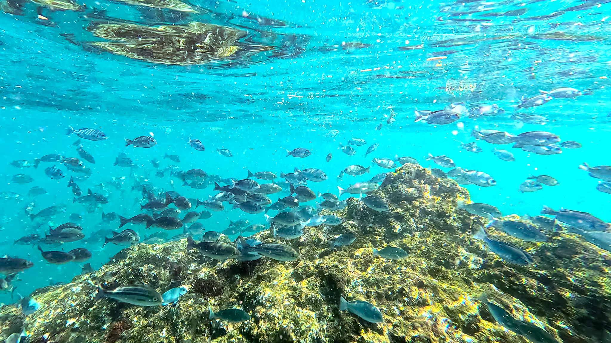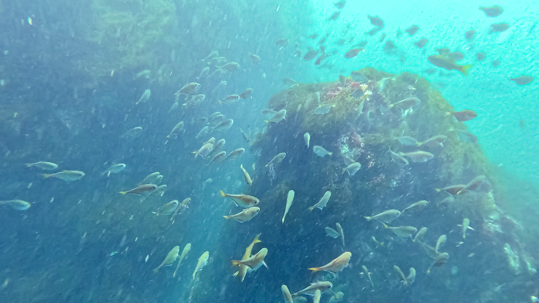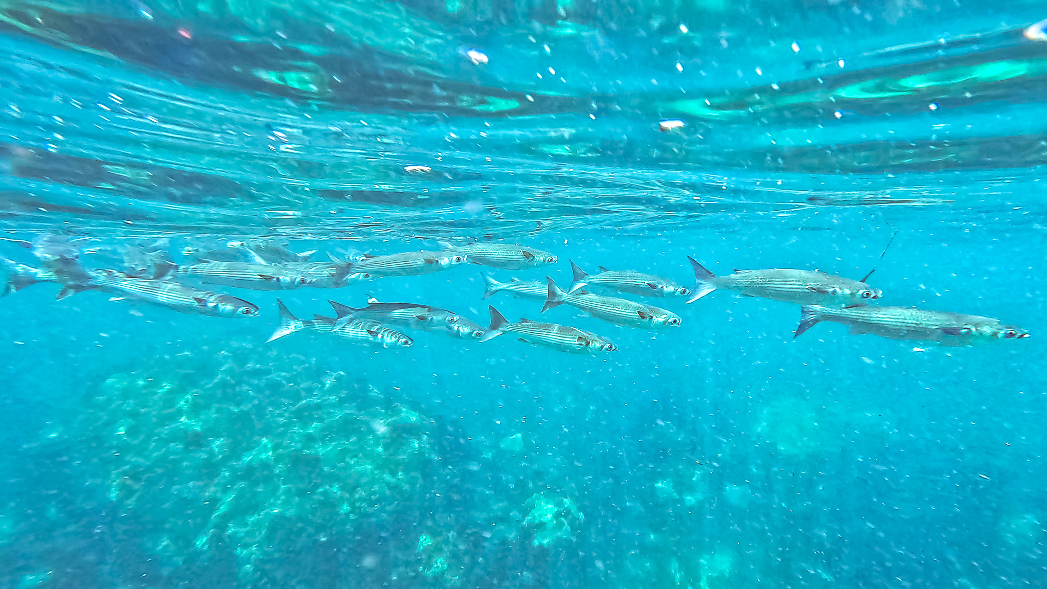 海面に浮かんでいると群れに囲まれ、そのうち頭にコツコツと何かが当たる感触がしたので、顔を出してみるとトウゴロウイワシがジャンプしまくっている。