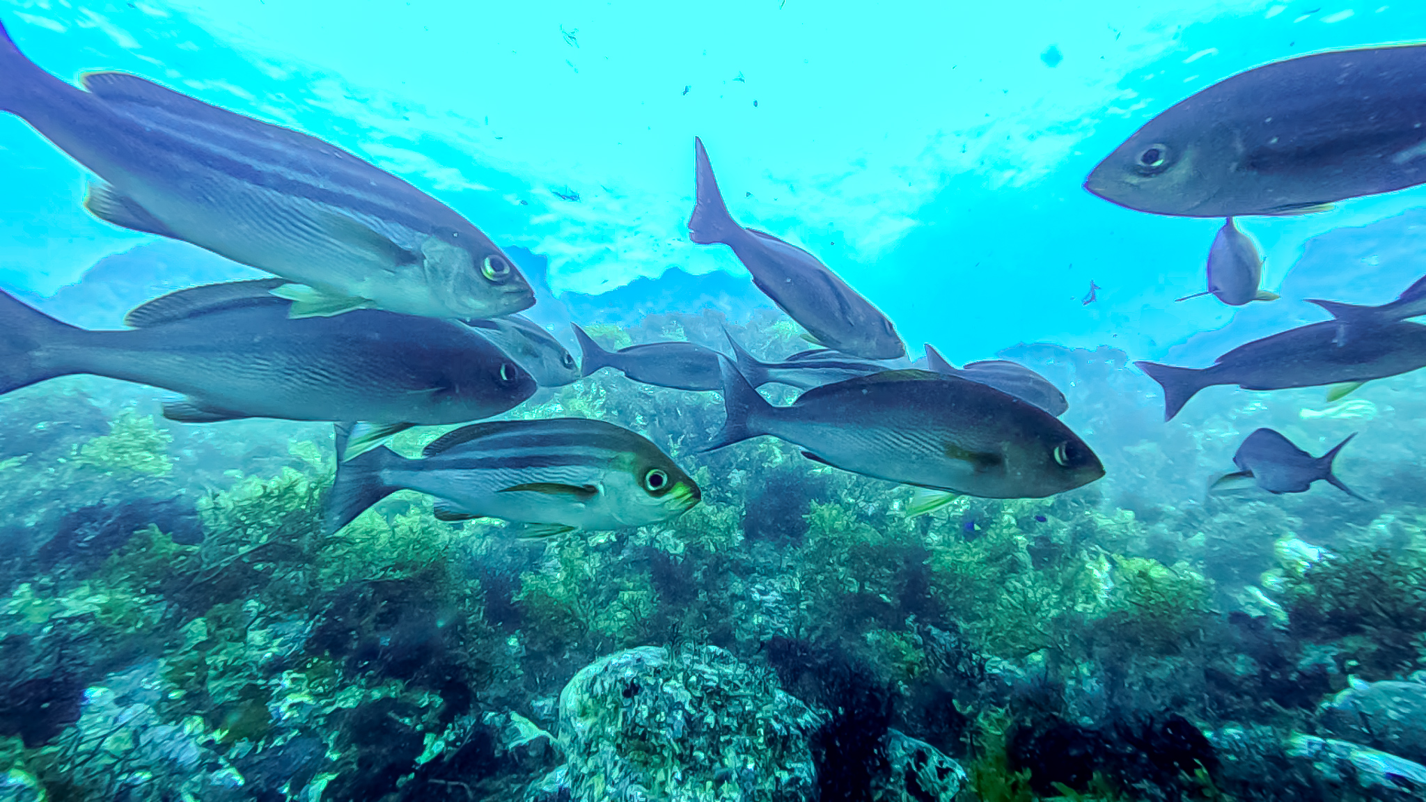⇒浅瀬はスズメダイ、アイゴ、ニザダイなど小型の種を中心に個体数が多くとっても賑やか。水温も高くシュノーケリングするには最高の時期。