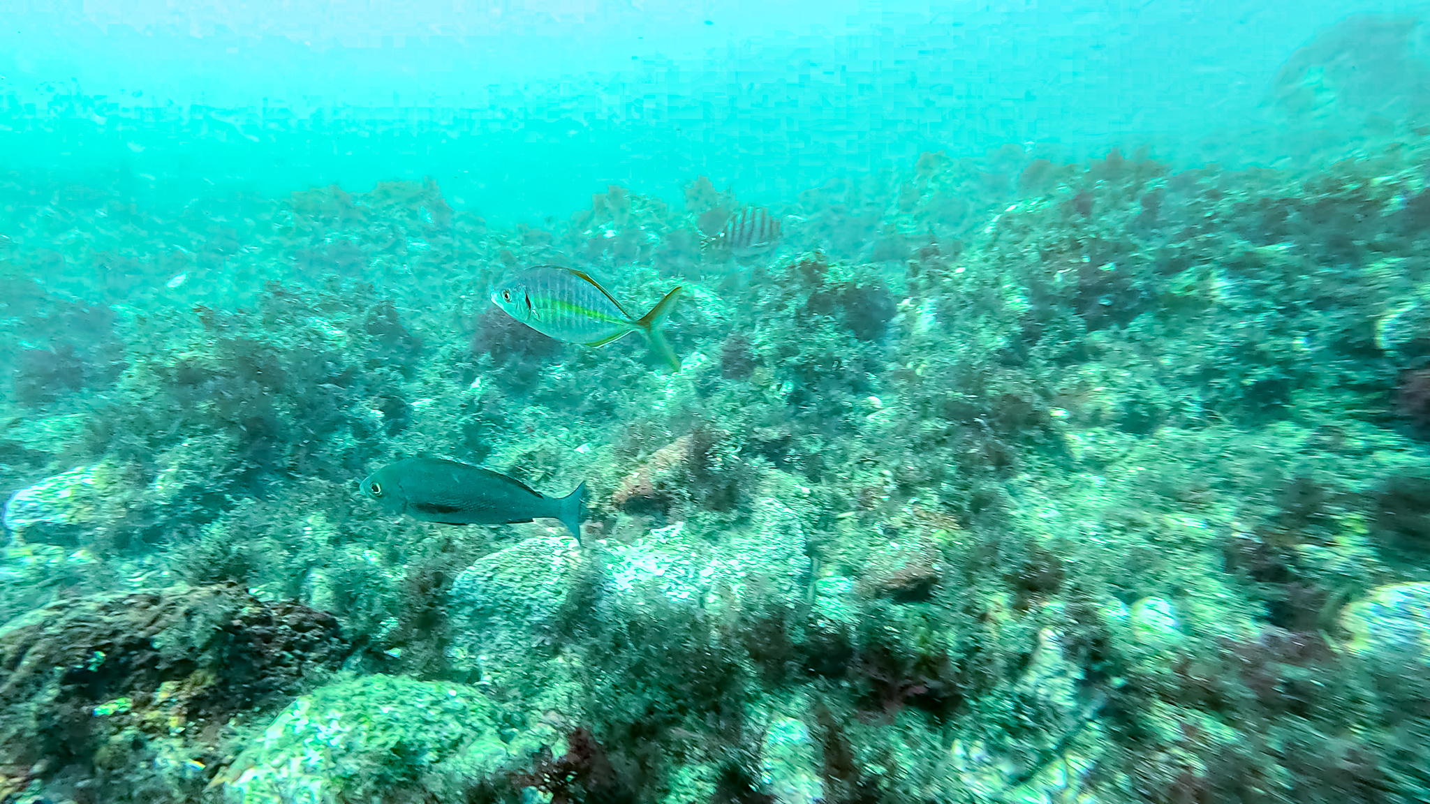 定点カメラに時折映るシマアジの小さな群れ。