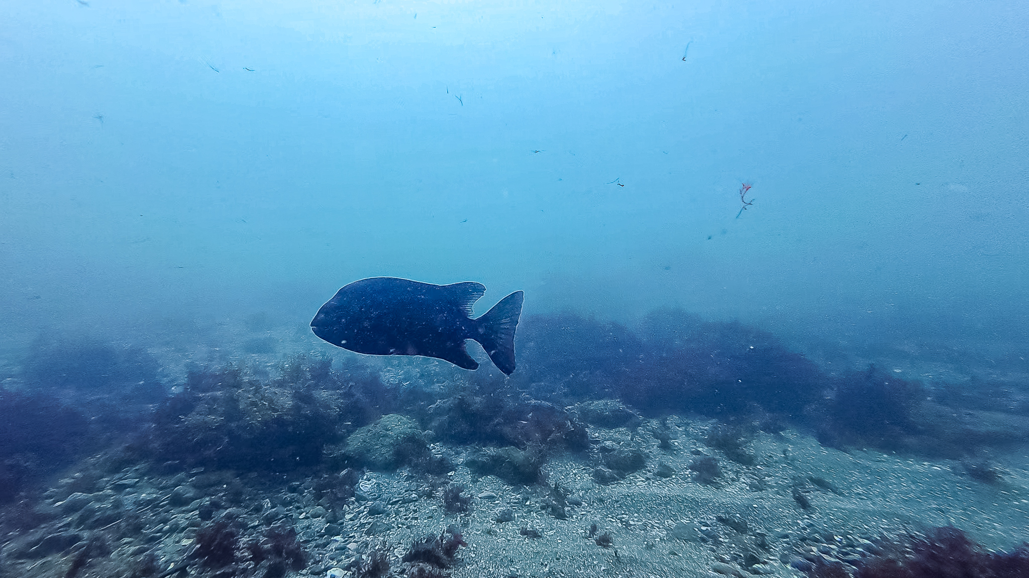 ⇒9月は深場も魚が多く、小メジナ、イスズミ、オジサン、ニザダイ、ブダイの仲間なんかが優勢。潜って着底すると色んな魚が興味津々で見に来るので楽しい季節。