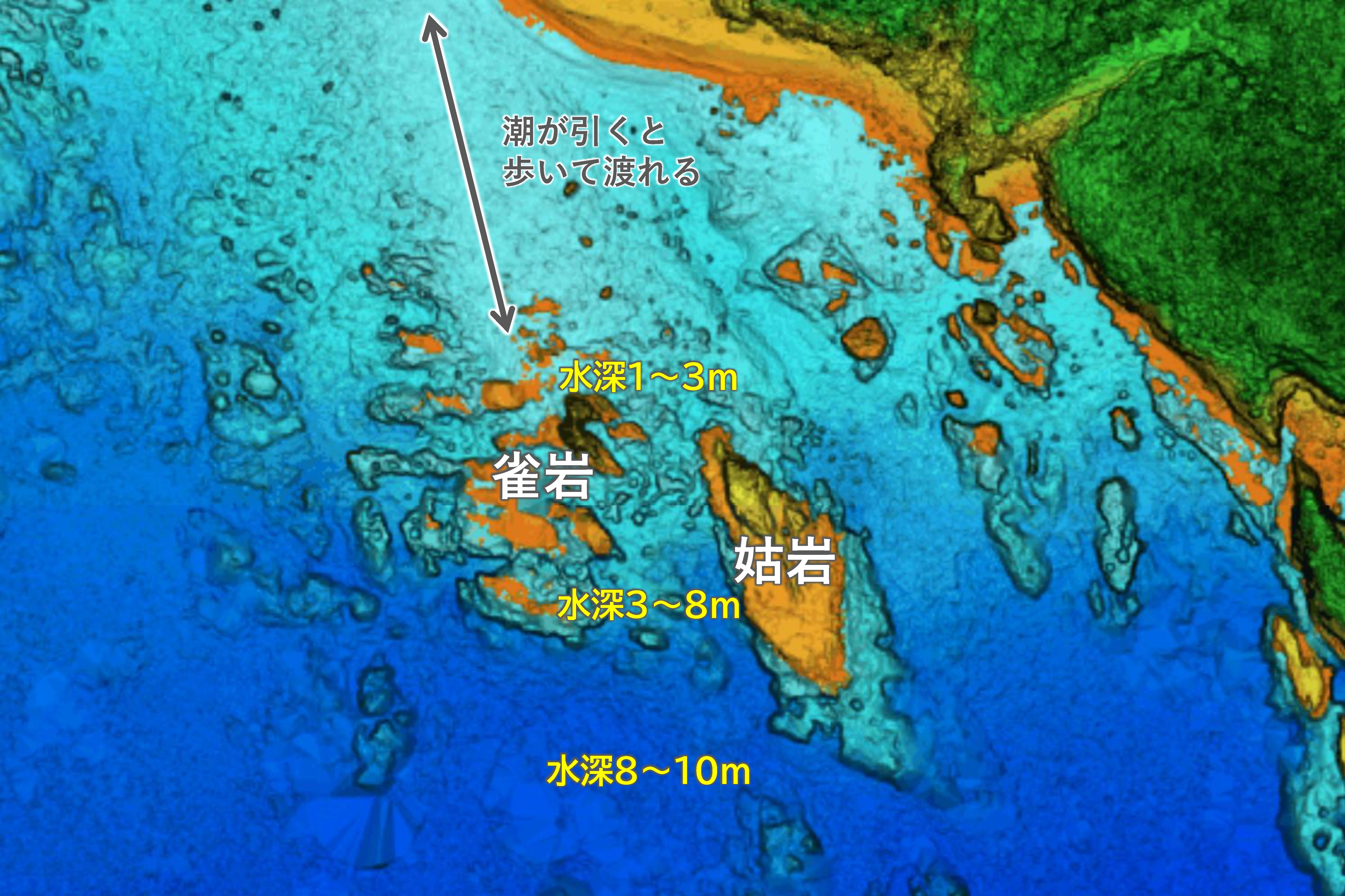 雀岩との間には水深8mほどの溝状の深みがあって西側は急深な形状、南~東にかけてはハエ根が張り出した地形で、周辺には根が点在する地形となっています。
