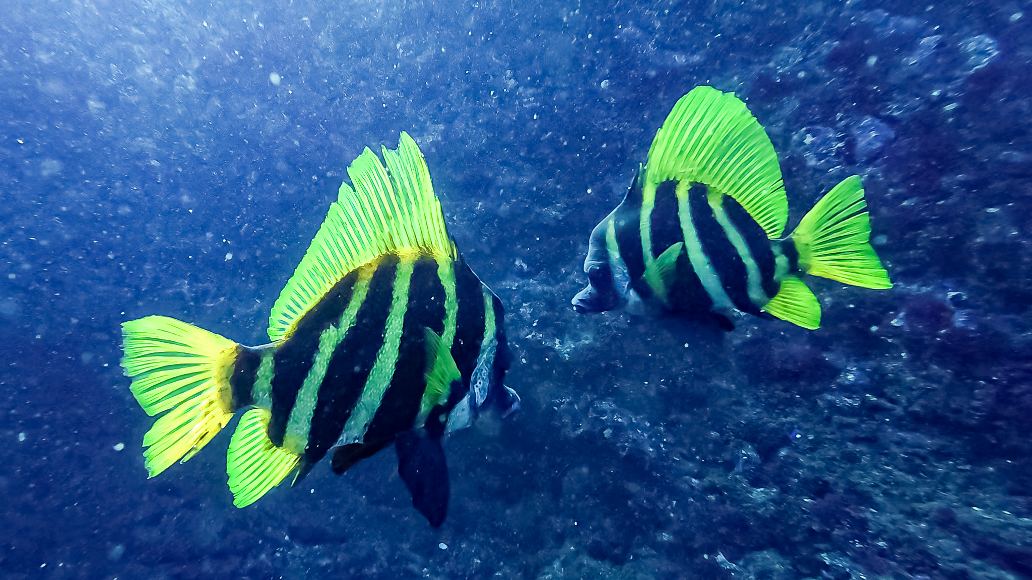 近づくと大きい方の手前の個体が小さい奥側の個体をかばうように泳いでいたので、大型の方がオスなのかなと妄想。